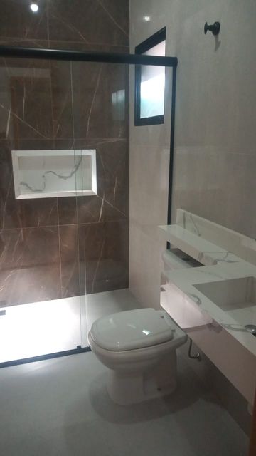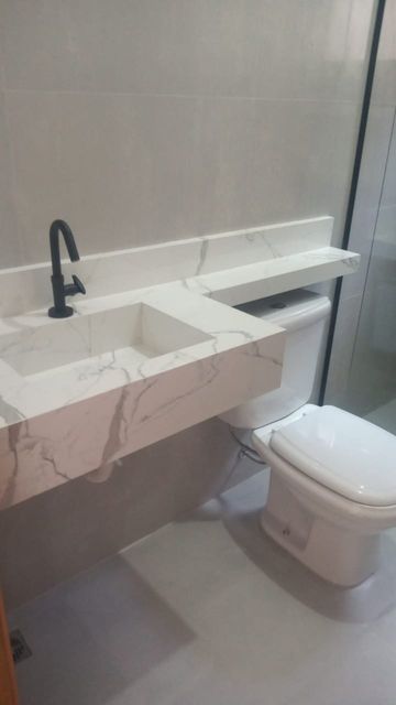Os banheiros são modernos, com lavabos e nichos em porcelanato, oferecendo praticidade e um visual contemporâneo.