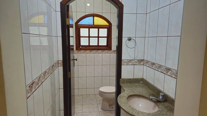 Nos fundos, destaca-se um amplo salão com churrasqueira, ideal para receber amigos e familiares, além de um quarto adicional e mais um banheiro, proporcionando versatilidade para espaço gourmet, salão de festas ou até mesmo uma área para hóspedes.