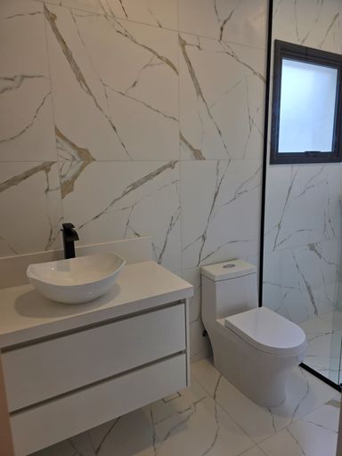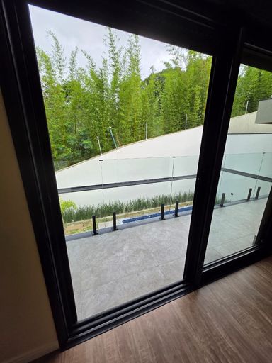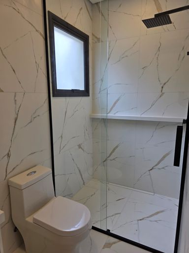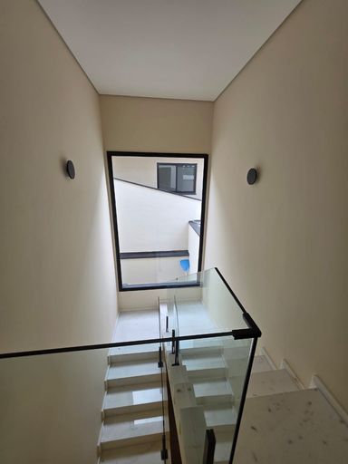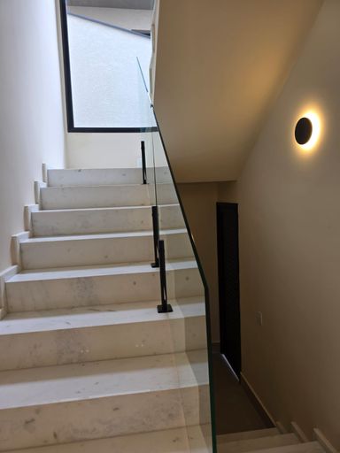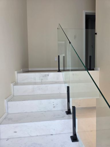 -escadaria em mármore branco escovado, guarda corpo em vidro