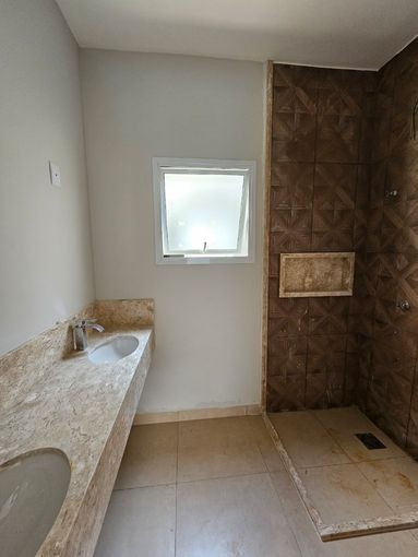 - Banheiros com revestimento em porcelanato e bancadas em mármore