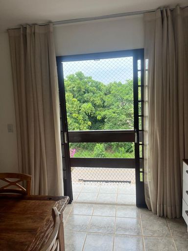 Sala de jantar com varanda voltada para área de mata, proporcionando vista verde e privacidade