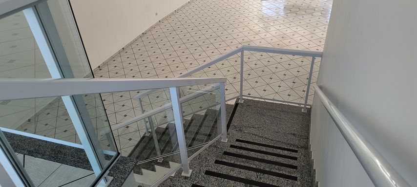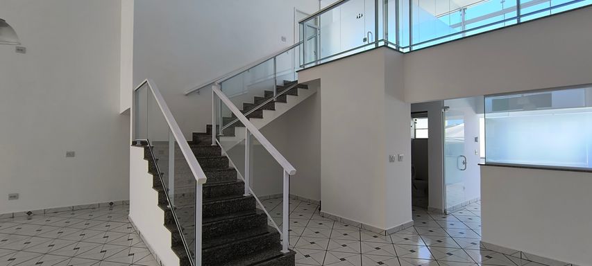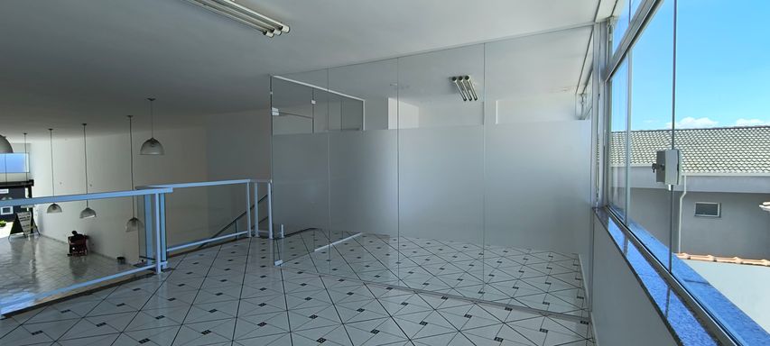 No piso superior, o mezanino com 49,01 m² dispõe de uma sala de reunião e 01 banheiro, perfeito para área administrativa ou atendimento reservado.